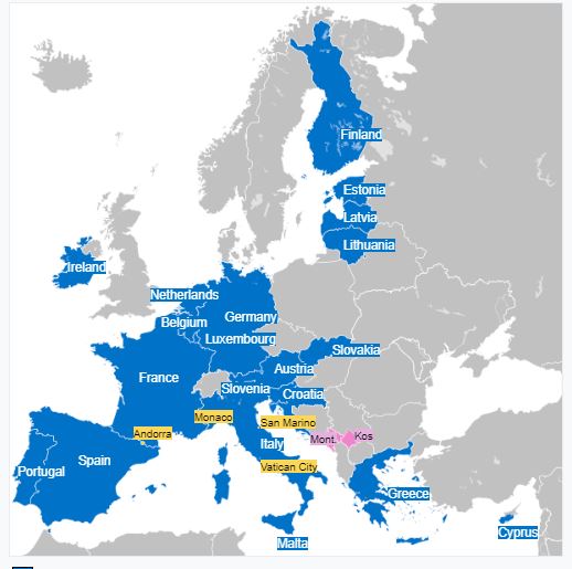 Austria, Belgium, Croatia, Cyprus, Estonia, Finland, France, Germany, Greece, Ireland, Italy, Latvia, Lithuania, Luxembourg, Malta, the Netherlands, Portugal, Slovakia, Slovenia, and Spain.